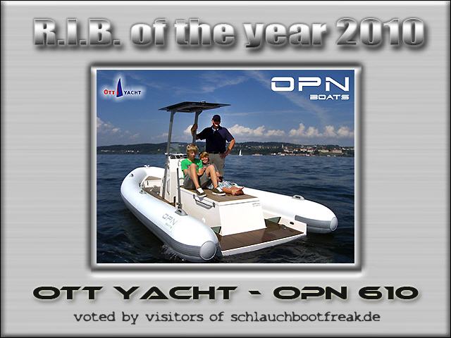 Fast als eine kleine Sensation kann man die erste Wahl zum "R.I.B. of the Year 2010" bezeichnen. Ab Sommer 2010 folgten insgesamt 287 Besucher unserem Aufruf: "Wählt das schönste, schnellste, größte, ungewöhnlichste, innovativste, sicherste oder einfach euer Traum-Rigid Inflatable Boat (R.I.B.) des Jahres 2010! Von Anfang an zwischen den "Großen am Markt" der Sieger 2010: OTT Yacht GmbH - OPN 610 - Herzlichen Glückwunsch!